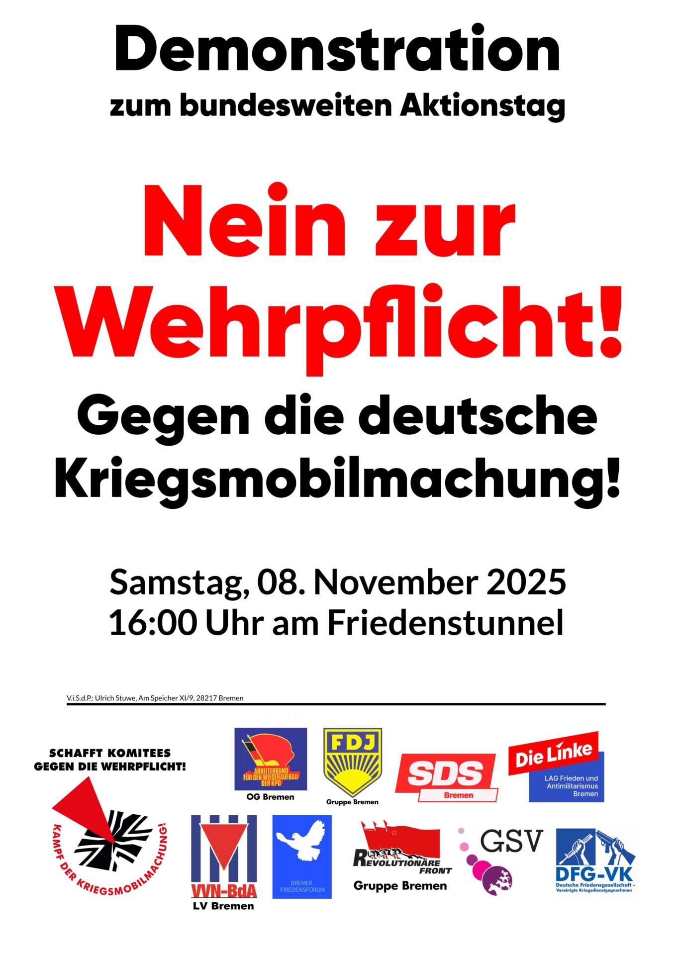 Um die Tätigkeit gegen das Wehrpflichtgesetz, die Erfassung und Rekrutierung ein Stuck weit zusammenzufassen, sollen am 8. November in möglichst vielen Städten Demonstrationen gegen die Wehrpflicht stattfinden. Statt der Zersplitterung, die wir uns im Antikriegskampf auf keinen Fall mehr leisten können, kann der 8.11. eine Möglichkeit darstellen, sich durch dezentrale Demonstrationen zu zentralisieren. Kein bestehendes Bündnis, keine Initiative gegen die Wehrpflicht soll damit infrage gestellt werden, im Gegenteil.