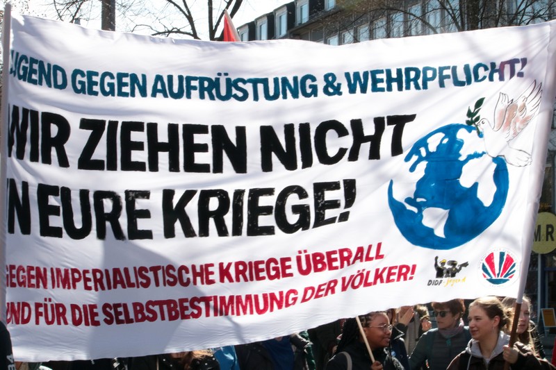 Denn diese Interessen sind nicht unsere, wir wollen gute Bildung und Arbeit und keine Zukunft voller Krieg und Krisen. Die Schulstreiks gegen die Wehrpflicht und die geringe Zustimmung zum Wehrdienst zeigen uns, die Jugend stellt sich gegen diese Entwicklungen. Eine starke Jugendbewegung gegen Krieg und Militarisierung ist für die deutsche Regierung und die Konzerne, die mit Waffenexporten und Krieg Profite machen, eine große Bedrohung. Deswegen versuchen sie gerade, uns mit aggressiver Werbung zu gewinnen oder durch Einschüchterungen klein zu halten!