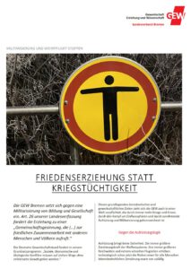 Die GEW (Landesverband Bremen) hat eine interessante Stellungnahme zum Thema „Friedenserziehung statt Kriegstüchtigkeit“ veröffentlicht – Tenor: Gegen Kriegsdienst und Militärpropaganda, gegen Aufrüstungslogik, für Frieden und Abrüstung: Friedenserziehung statt Kriegstüchtigkeit.