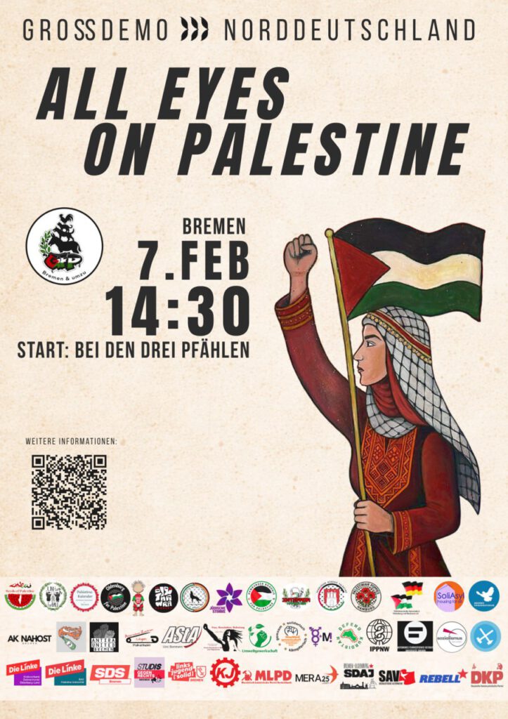 Unterstützt die Aktivitäten der Palästina-Solidarität: die wöchentlichen Demos der PG, die samstägliche Mahnwache vor dem Dom. Besucht die Info-Veranstaltungen zur Situation im Nahen Osten. Informiert Euch auf den einschlägigen Webseiten, z.B. beim Bremer Friedensforum