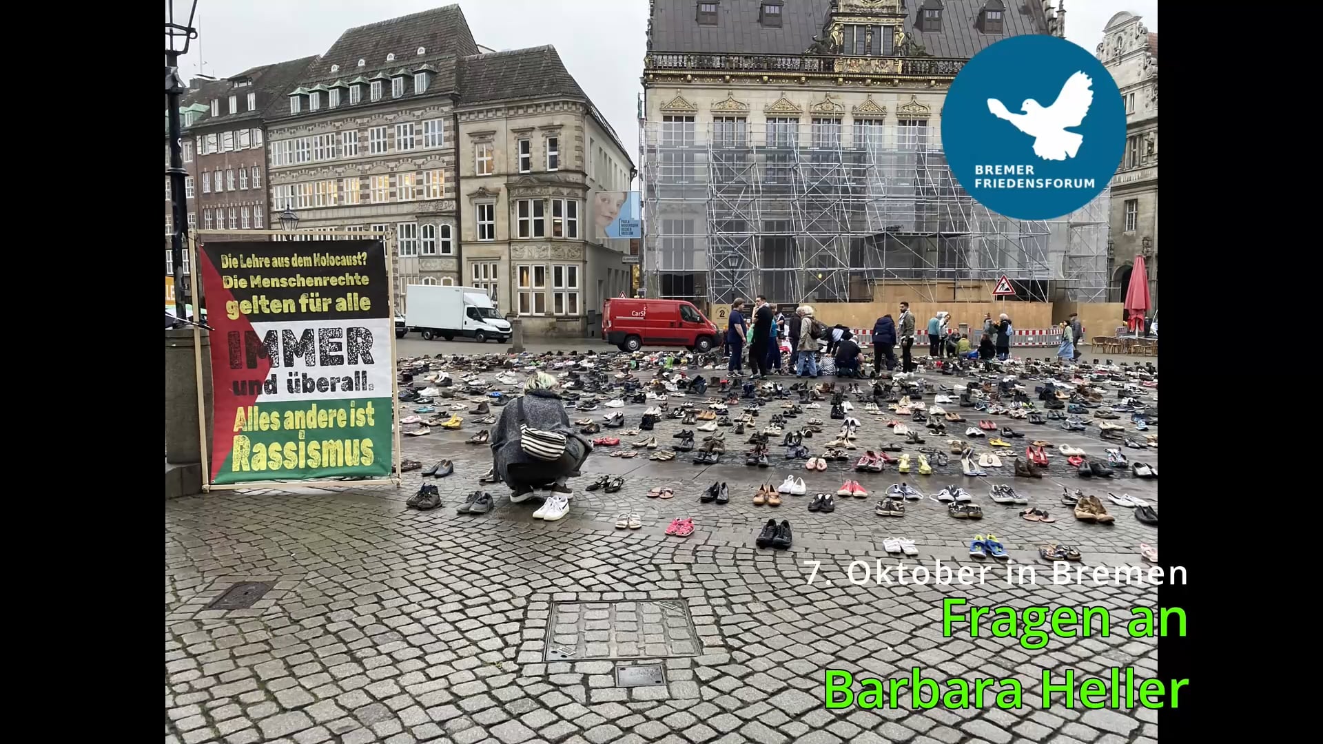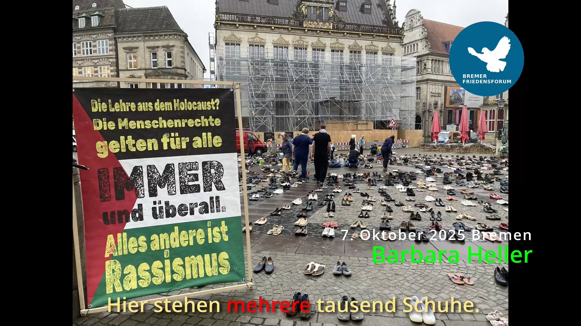Das Bremer Friedensforum unterstützte die Aktion aus der palästinensischen Community, bei der mehr als 10.000 Paar Schuhe auf dem Bremer Marktplatz aufgestellt wurden.