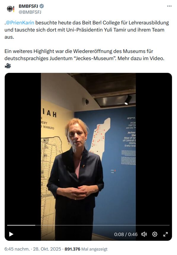 Auf das Schärfste verurteilt die Deutsch-Palastinensische Gesellschaft (DPG) die Veröffentlichung eines Videos auf den offiziellen Kanälen des Bundesbildungsministeriums, in dem Ministerin Karin Prien wahrend ihres Israel-Besuchs vor einer Karte steht, auf der das besetzte Westjordanland und die völkerrechtswidrig annektierten Golanhöhen als Teil Israels dargestellt werden.