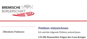 Eine Petition setzt sich für humanitäre Reaktionen der bremischen Politik und Verwaltung auf Folgen des Gazakrieges ein.