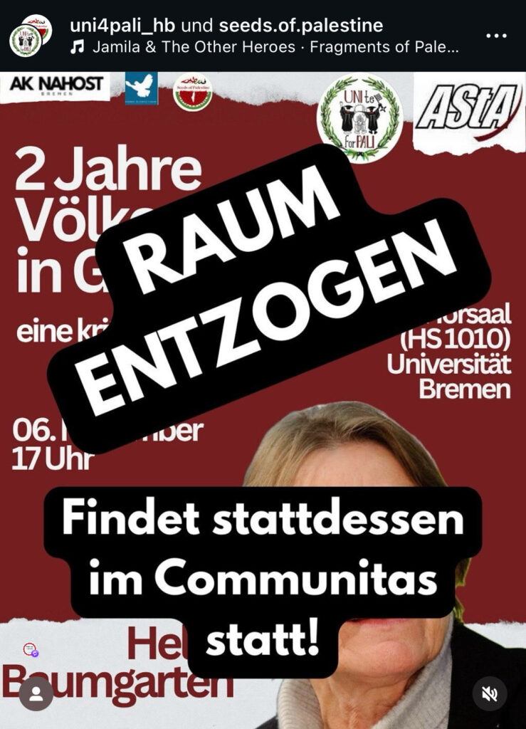 Helga Baumgarten (Jerusalem): 2 Jahre Genozid – eine kritische Analyse (Bremen - Uni - Kleiner Hörsaal)