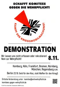 Um die Tätigkeit gegen das Wehrpflichtgesetz, die Erfassung und Rekrutierung ein Stuck weit zusammenzufassen, sollen am 8. November in möglichst vielen Städten Demonstrationen gegen die Wehrpflicht stattfinden. Statt der Zersplitterung, die wir uns im Antikriegskampf auf keinen Fall mehr leisten können, kann der 8.11. eine Möglichkeit darstellen, sich durch dezentrale Demonstrationen zu zentralisieren. Kein bestehendes Bündnis, keine Initiative gegen die Wehrpflicht soll damit infrage gestellt werden, im Gegenteil.