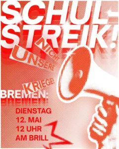 Am 12. Mai bestreiken wir in Bremen die Schulen! Gegen die Aufrüstung, gegen die Wehrpflicht und gegen den Krieg! Wir wollen nicht in ihren Kriegen sterben! Wir erklären den Kriegstreibern den Krieg! Sollen sie zittern vor einer widerständigen Jugend!