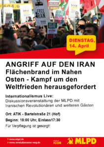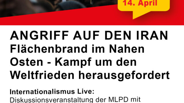 Angriff auf den Iran – Kampf um den Weltfrieden Termin Details Datum: 14.04.2026 18:00 – 20:00 Ort: Hamburg, ATIK Terminkategorien: Veranstaltung Podiumsdiskussion mit Vertretern vom Iran, Palästina und Kurdistan. Veranstalter: MLPD Küste. Ort: Hamburg