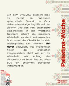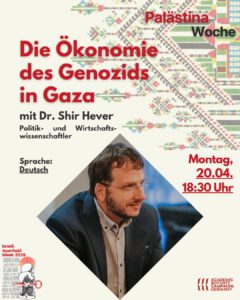 Dr. Shir Hever: Die Ökonomie des Genozids in Gaza Termin Details Datum: 20.04.2026 18:30 Ort: Bremen, Universität Terminkategorien: Veranstaltung Der Vortrag findet an der Uni im „Communitas“ statt.