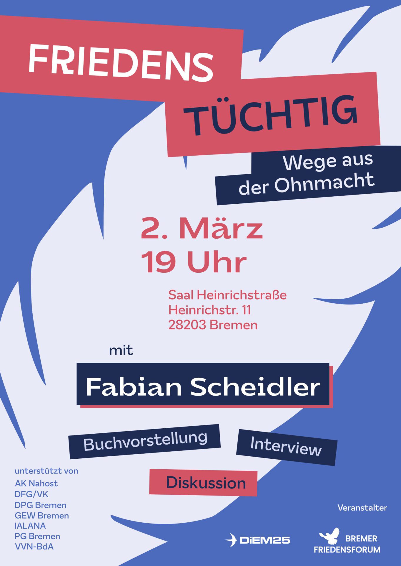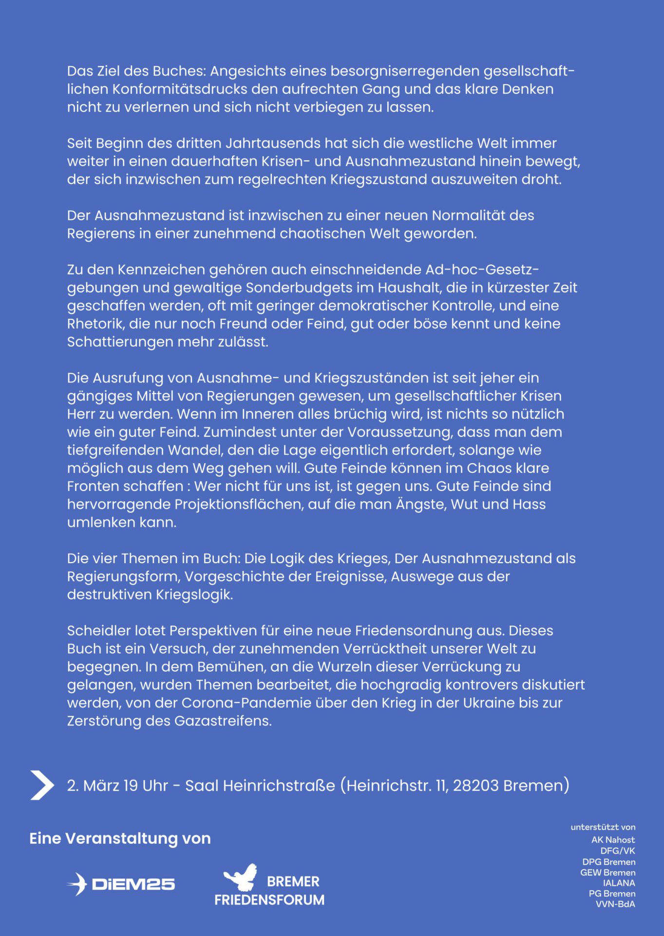 Eine Veranstaltung vom Bremer Friedensforum und von Diem25 – unterstützt von AK Nahost, DFG/VK, DPG Bremen, GEW Bremen, IALANA, PG Bremen und VVN-BdA.