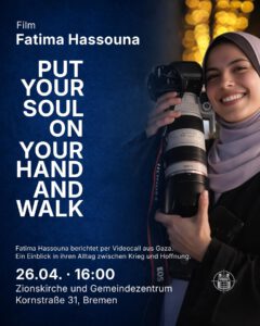 Film: Fatima Hassouna – Put Your Soul on Your Hand and Walk Termin Details Datum: 26.04.2026 16:00 Ort: Bremen, Theatersaal Zion (Eingang Kantstraße) Terminkategorien: Veranstaltung Film: Fatima Hassouna – Put Your Soul on Your Hand and Walk Zionskirche und Gemeindezentrum, Kornstraße 31, Bremen PRESSEFREIHEIT IM SCHATTEN DER STAATSRÄSON Aktionsreihe 26. April – 4. Mai 2026