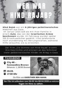Am heutigen Donnerstag wird der Schwerpunkt der Mahnwache auf der Erinnerung an das Mädchen Hind Rajab liegen, die von Soldaten der israelischen Armee über Stunden auf unglaublich sadistische Weise im Auto ihrer Verwandten zu Tode gebracht wurde.