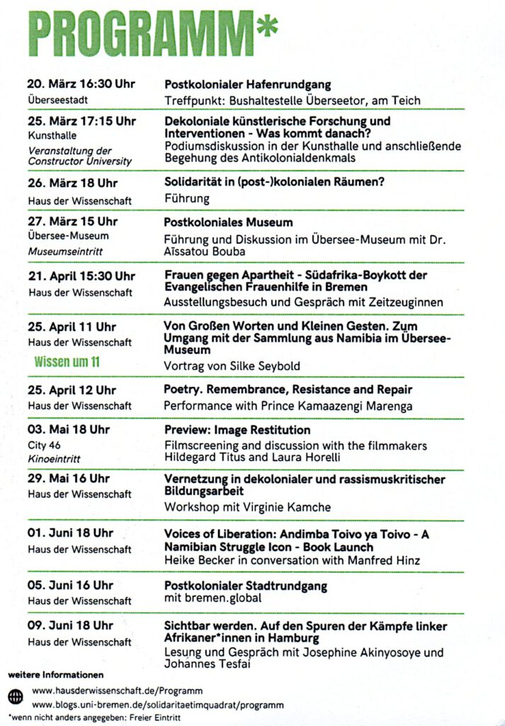Von Großen Worten und Kleinen Gesten: Zum Umgang mit der Sammlung aus Namibia im Überseemuseum Termin Details Datum: 25.04.2026 11:00 Ort: Bremen, Haus der Wissenschaft Terminkategorien: Veranstaltung Von Großen Worten und Kleinen Gesten: Zum Umgang mit der Sammlung aus Namibia im Überseemuseum Vortrag von Silke Seybold Veranstaltungsreihe: