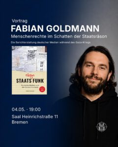 Vortrag mit Journalist und Medienkritiker Fabian Goldmann : „Menschenrechte im Schatten der Staatsräson“ – Die Berichterstattung der deutschen Medien während des Gazakrieges